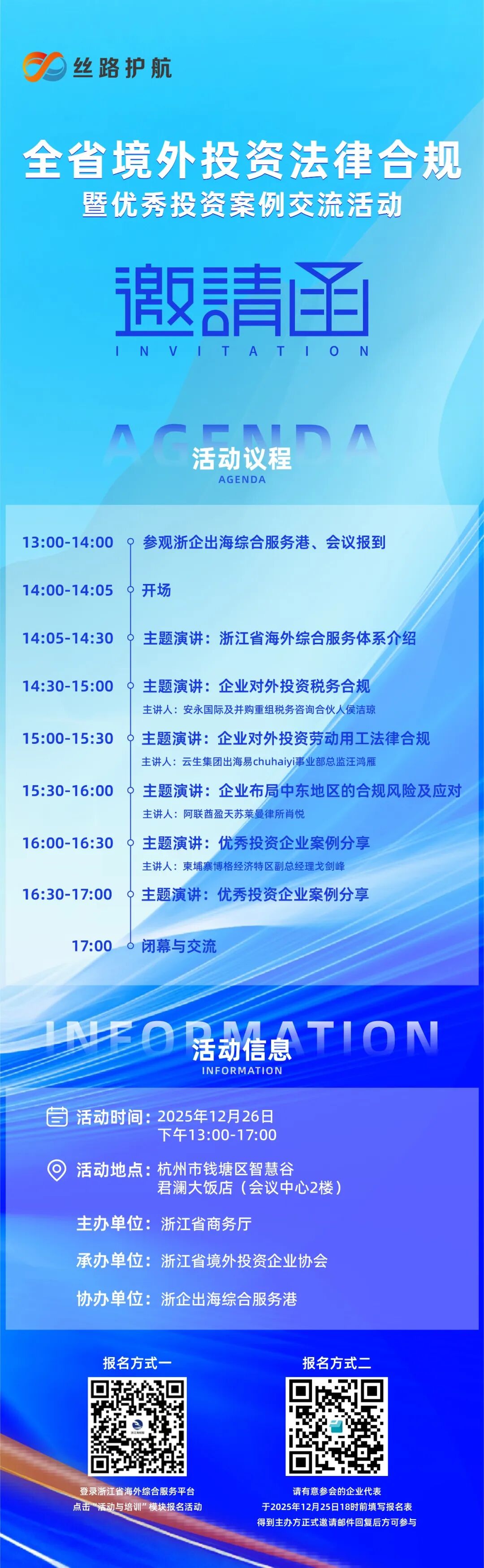 为帮助企业更好地应对合规诉求,由浙江省商务厅主办、浙江省境外投资企业协会承办、浙企出海综合服务港协办的“全省境外投资法律合规暨优秀投资案例交流活动”将于2025年12月26日13:00-17:00在杭州市钱塘区智慧谷君澜大饭店举办。