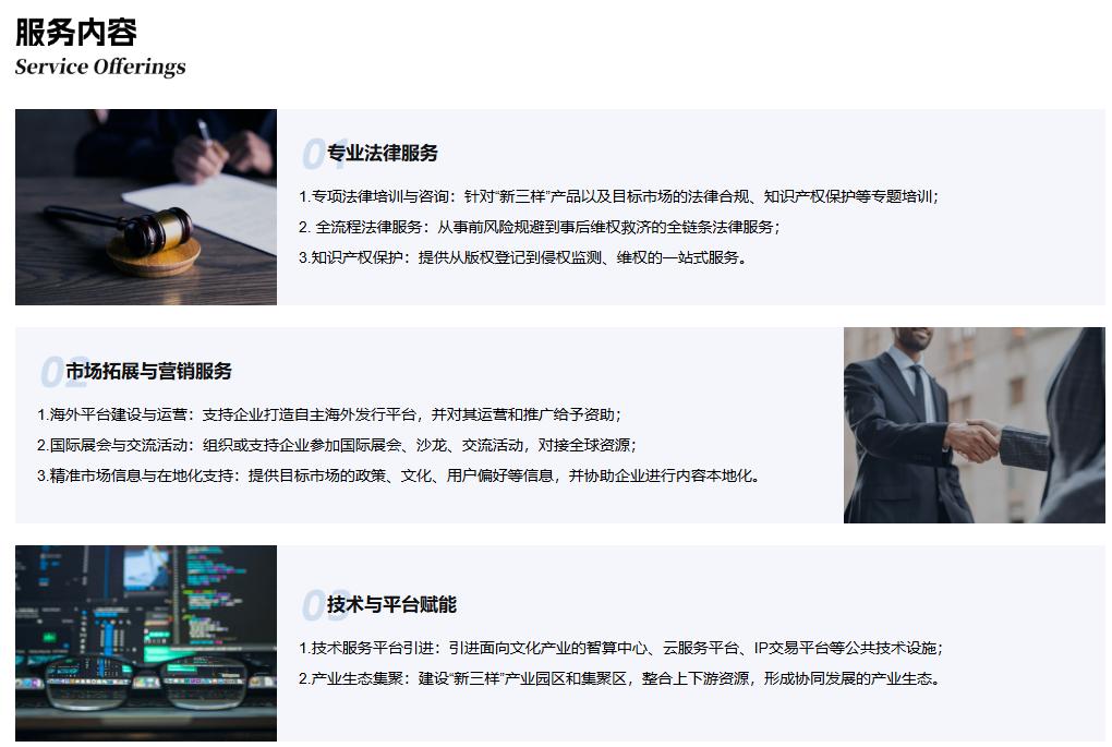 系统呈现在文化出海领域的专业服务内容,涵盖法律服务、市场拓展与营销支持、技术与平台赋能三大方向,全面响应企业在文化出海各环节的实际需求。