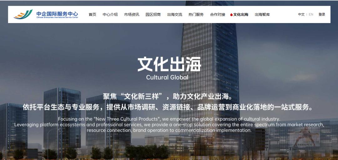 近期,中企国际服务中心网站“文化出海”板块上线,旨在为浙江文化产业构建一个专业的一站式赋能平台。拥有完备的专业服务商网络,汇聚了法律、财务、媒体及全球人才招聘等关键领域的伙伴,为企业提供后端支持。