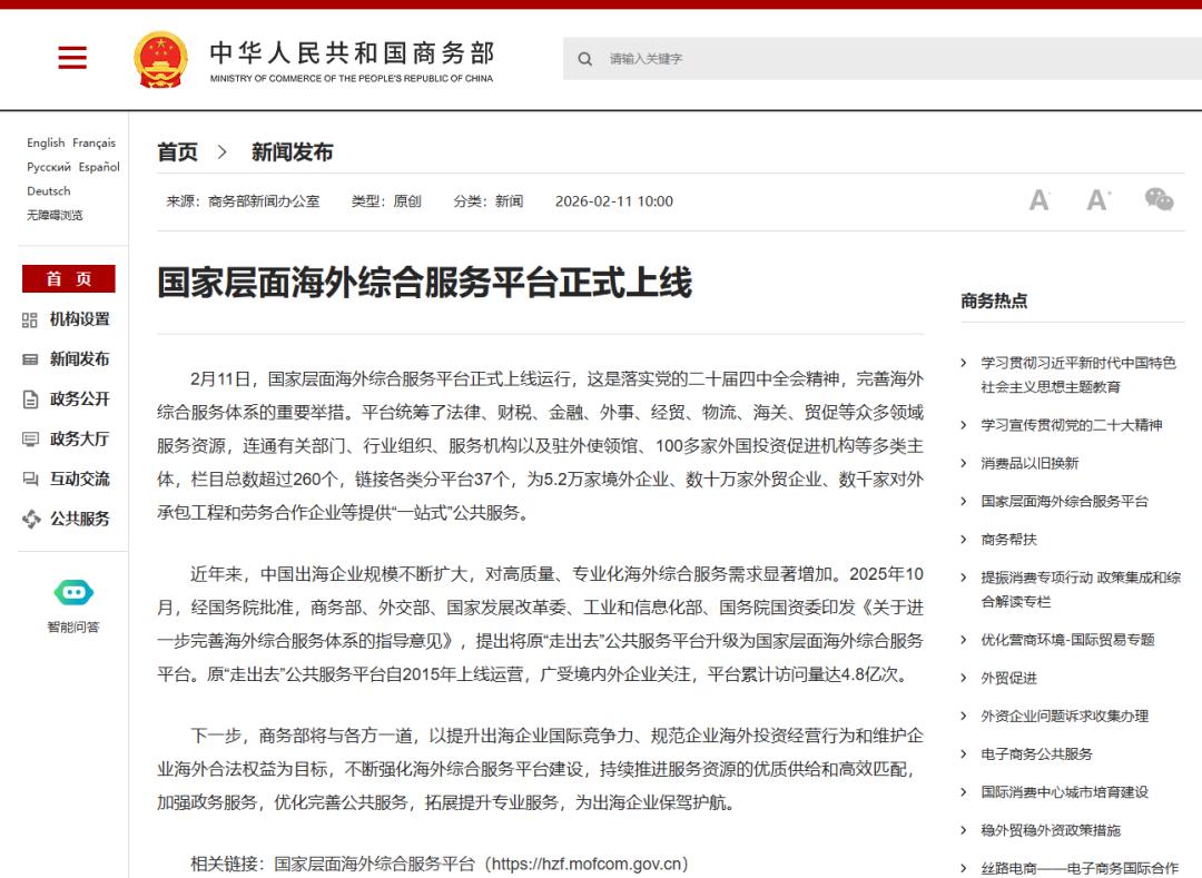2月11日,国家层面海外综合服务平台正式上线运行,这是落实党的二十届四中全会精神,完善海外综合服务体系的重要举措。平台统筹了法律、财税、金融、外事、经贸、物流、海关、贸促等众多领域服务资源,连通有关部门、行业组织、服务机构以及驻外使领馆、100多家外国投资促进机构等多类主体,栏目总数超过260个,链接各类分平台37个,为5.2万家境外企业、数十万家外贸企业、数千家对外承包工程和劳务合作企业等提供“一站式”公共服务。